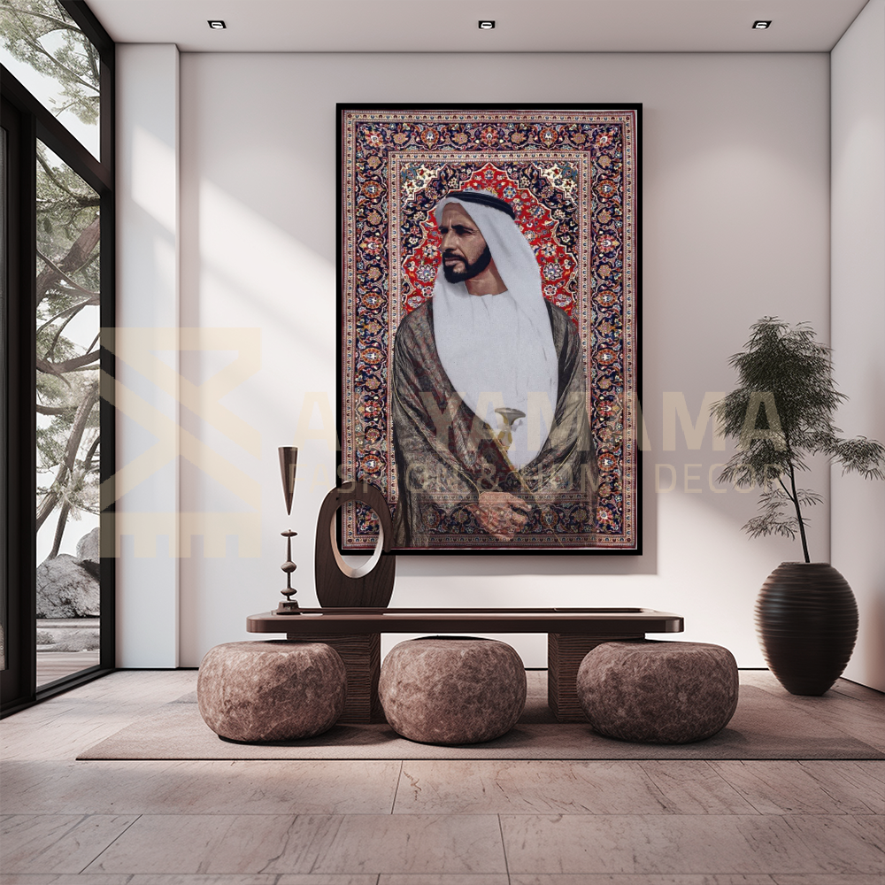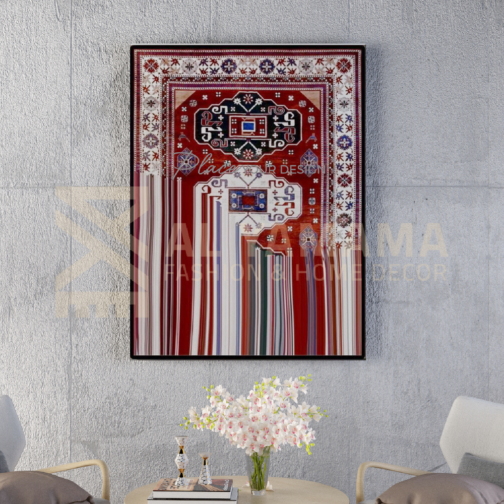 This painting combines traditional Iranian carpet art with a realistic image of a purebred horse in a prancing position, symbolizing strength, antiquity, and flight. The finely woven background bears geometric patterns and traditional shapes, enhancing the beautiful contrast between authenticity and modernity in the design.